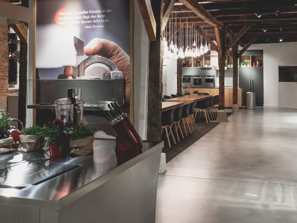 Auf 300 m² Ausstellungsfläche werden freistehende wie integrierte Geräte in verschiedenen Anwendungsszenarien präsentiert. Die offene Raumstruktur ermöglicht Besucherführung, Präsentation und Veranstaltungen gleichermaßen. Der Showroom dient als inspirierender Treffpunkt für Händler, Architekt:innen und Endkund:innen – insbesondere während der jährlich stattfindenden Events der Küchenmeile A30.