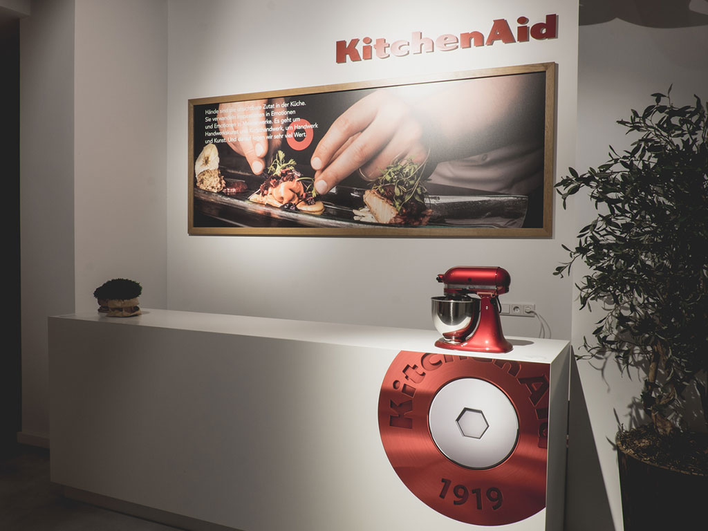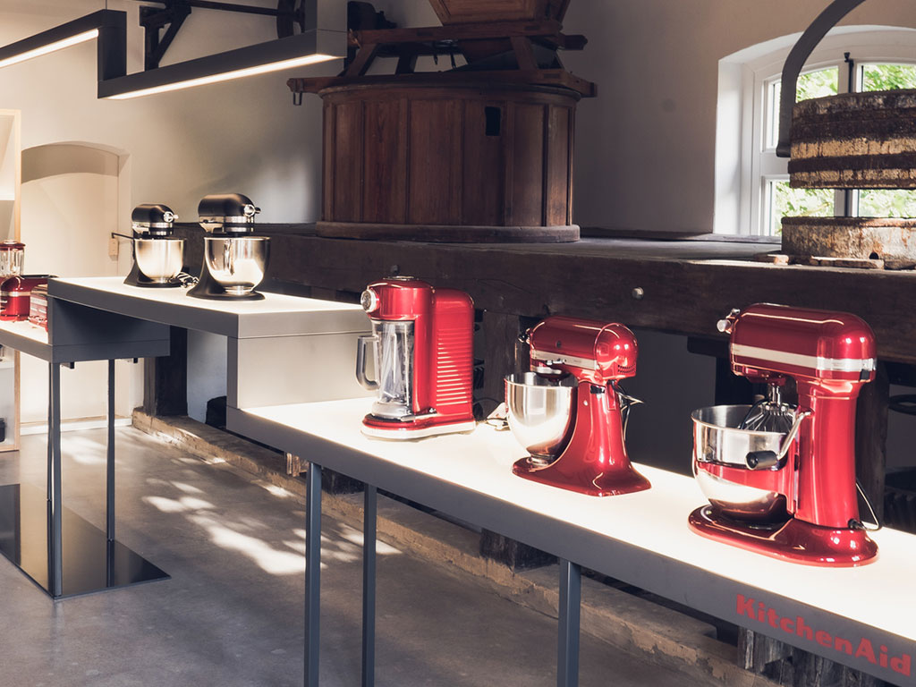 Seit fast 100 Jahren steht KitchenAid für kompromisslose Qualität, professionelle Funktionalität und ikonisches Design. Neben der legendären „Artisan Küchenmaschine“ umfasst das Sortiment heute eine breite Palette hochwertiger Produkte. Der Showroom auf Gut Böckel macht diese Markenwerte räumlich erlebbar und vermittelt ein authentisches Markenerlebnis.