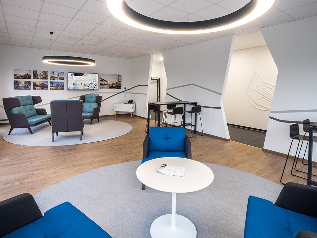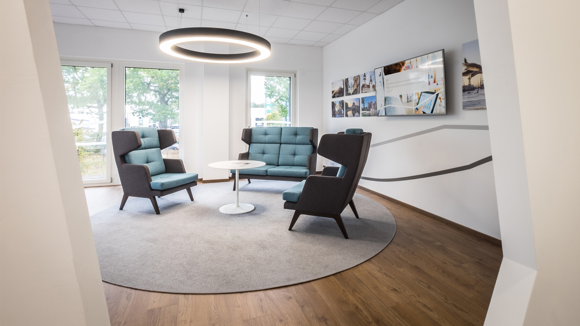Im Empfangsbereich werden Kunden in heller, freundlicher Atmosphäre willkommen geheißen. Unterschiedlich gestaltete Sitzbereiche ermöglichen diskrete Erstgespräche und kurze Wartezeiten in angenehmer Umgebung.