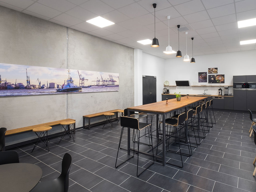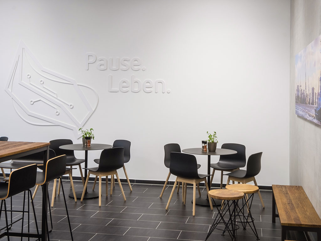 Für die Mitarbeitenden entstand ein inspirierender Raum für Pausen und Austausch: Eine moderne Küchenzeile, ein zentraler Community Table und grafisch gestaltete Wände schaffen eine entspannte, kommunikative Atmosphäre.